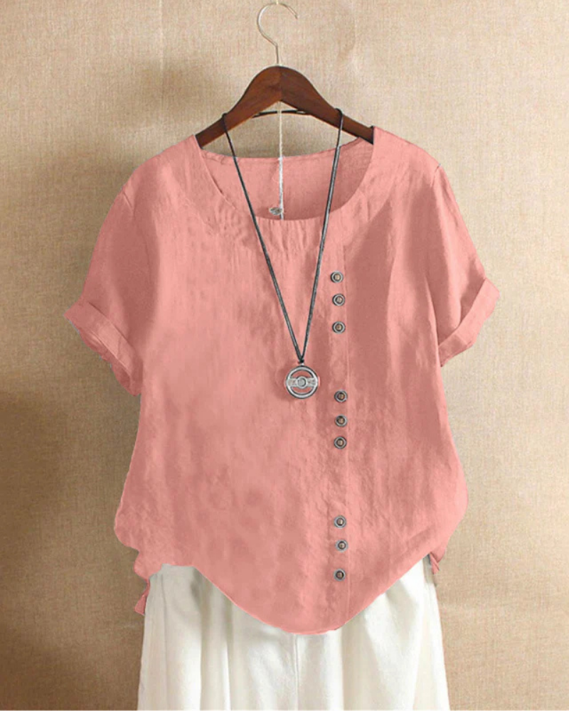 Entdecken Sie mühelosen Stil mit einer Bluse, die Ihrer täglichen Garderobe Selbstbewusstsein verleiht. Die Freizeitbluse Kellie kombiniert eine lockere Silhouette mit einem modernen asymmetrischen Knopfakzent für ein dezentes und dennoch auffälliges Finish. Dieses vielseitige Damenoberteil eignet sich perfekt für Freizeit, Büro oder Wochenendausflüge und macht das Anziehen einfach und natürlich.